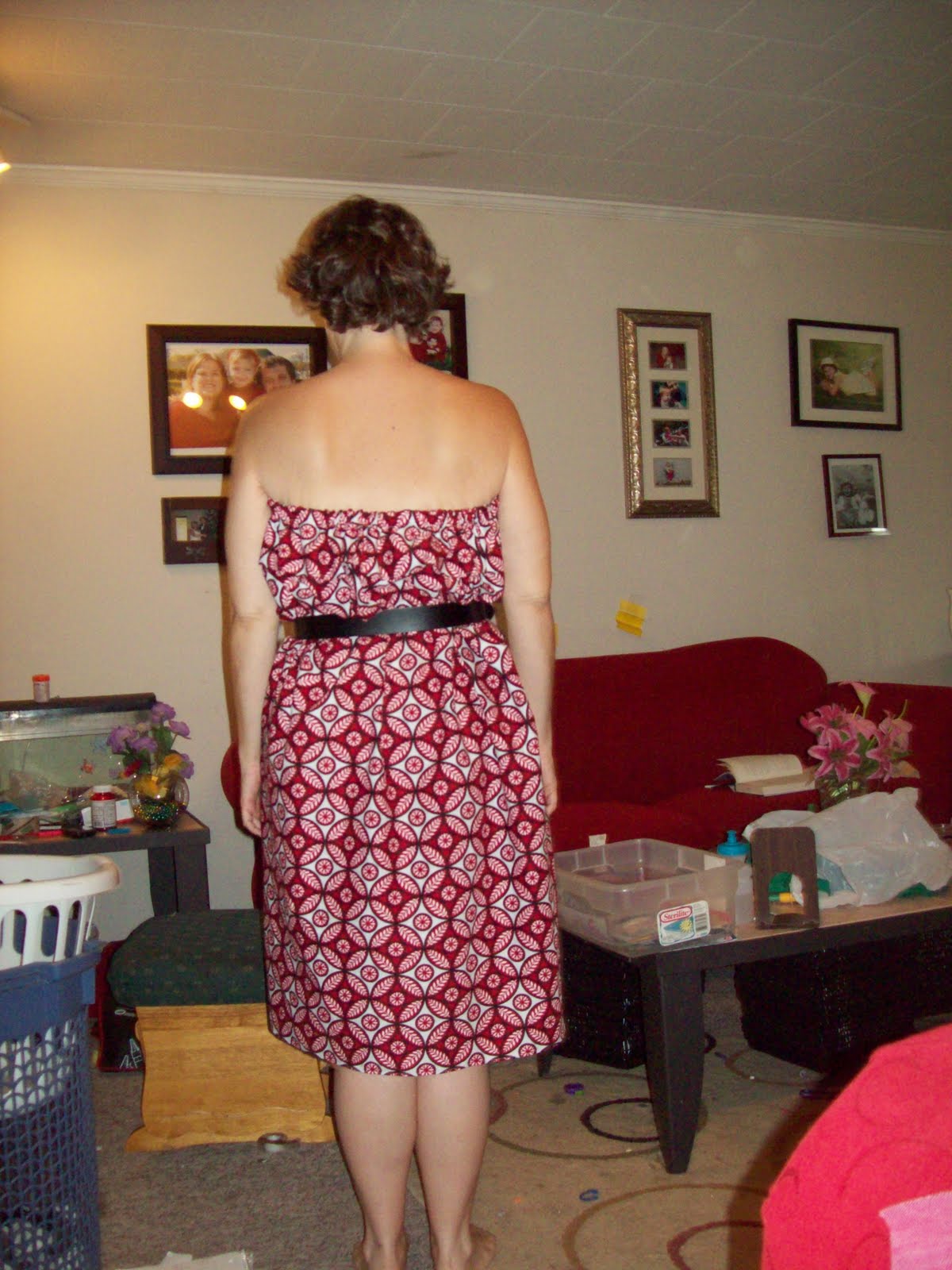 this dress. I used 2 yards of red and white fabric. It is made of 2 rectangles. The instructions say to use your hip measurement x 1.5. Mine was 42, which made 63. Which was too big. So if I do it again, I'll use 55 or so. The length was 35, which was fine - hits just below the knee. It's not tailored at all, which is fine. It looks great with a belt. The elastic was supposed to be the high bust, but mine was too big, so I had to cut some off. I like it. I'll probably wear it @ Gracie's bday party and maybe the 1st day of school with a cardigan. Ignore the fact that I can't find my strapless bra. And the mess behind me.